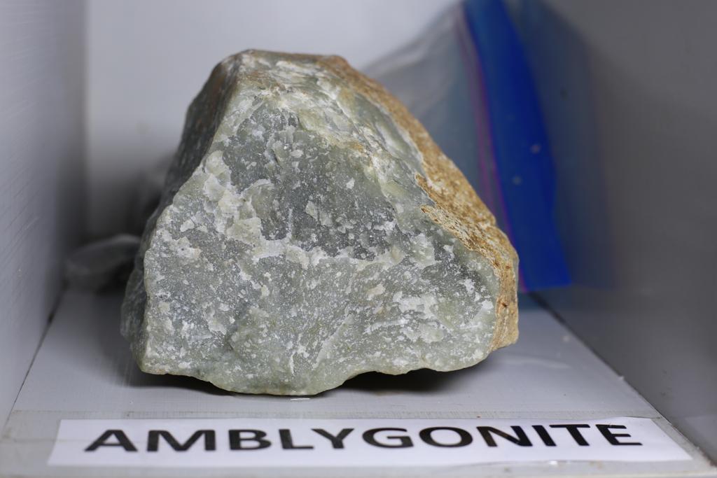Amblygonite, a fluorophosphate mineral in lithium-rich granite pegmatites, is valued for its role as a lithium ore and its applications in ceramics and glass manufacturing.