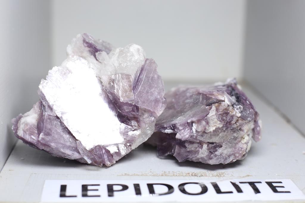 Lepidolite, a lithium-rich mica mineral with a lavender to pink hue, serves as a source of lithium and is prized for its occasional use as a gemstone in jewelry.